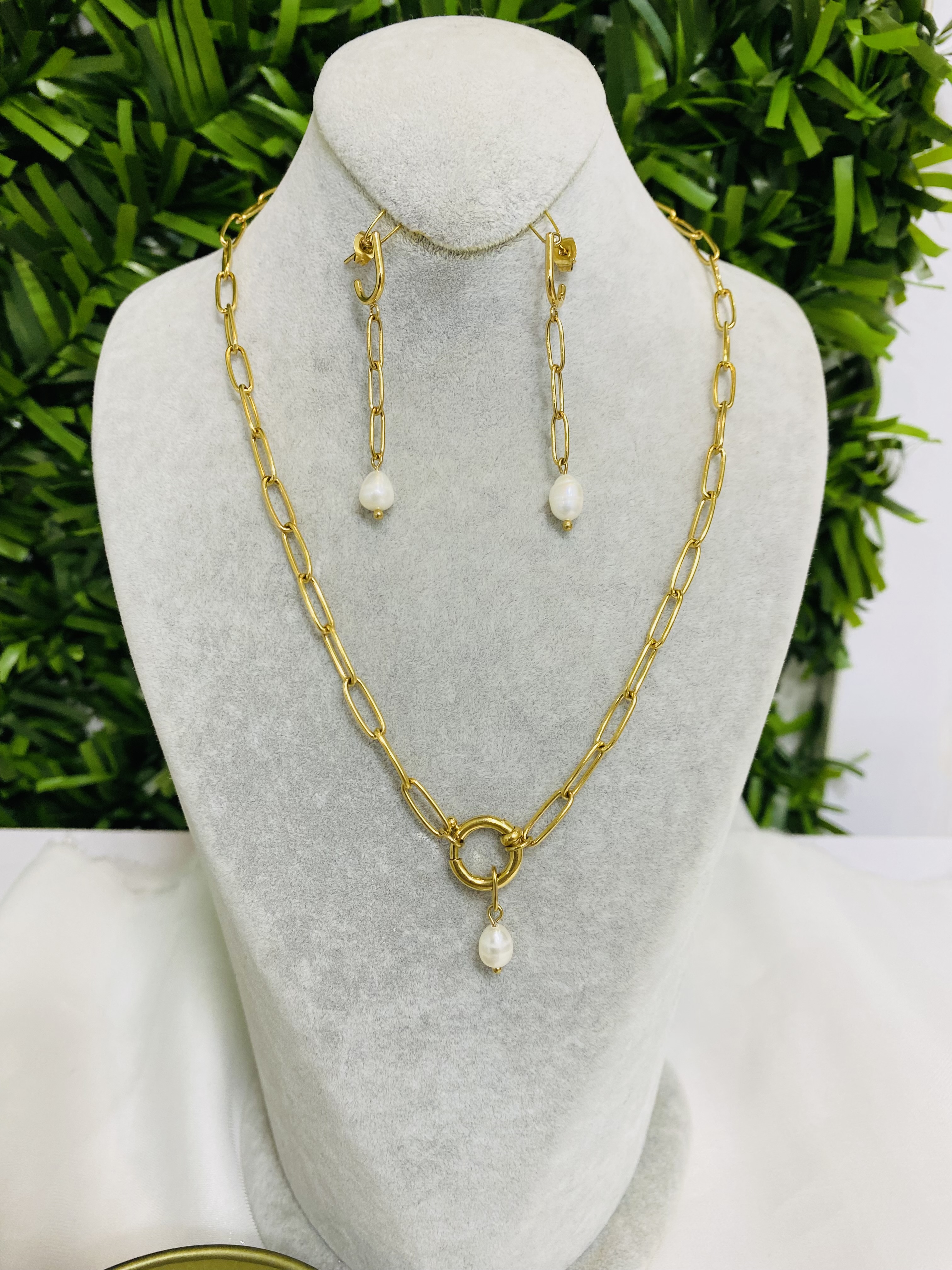 گردنبند و گوشواره کاملا مشابه طلا همراه با ضمانت رنگ ثابت بودن مروارید پروروشی و طبیعی